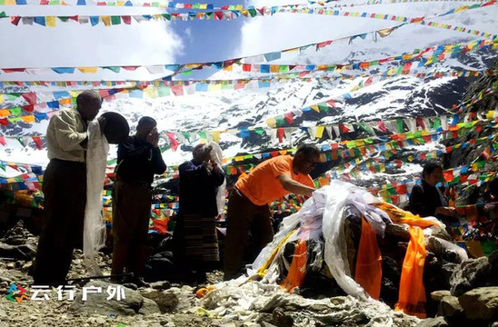 第三天:早餐后便开始前往大本营和冰湖,来回约有24公里,去的时候全程上坡,中间要过一个3500米的垭口,一般到达笑农大本营的时间正好是中午,笑农大本营是曾经中日联合登山队的营地,现在成为了前往冰湖途中的一个休息驿站,在这里可以喝当地藏民出售的酥油茶或吃碗方便面,休息片刻,再前往海拨4100左右的冰湖。从大本营前往冰湖都是上坡,最辛苦的一段是临近冰湖的了个大陡坡,约有一公里的路程,徒步这最后一公里,感觉怎么走也走不到头,但最后当你站在冰湖前,见到美丽如翡翠般的圣湖时,发现这一切辛苦都值得的。不认识路也没关系,跟着前行驴友的脚步,基本上不会迷路。