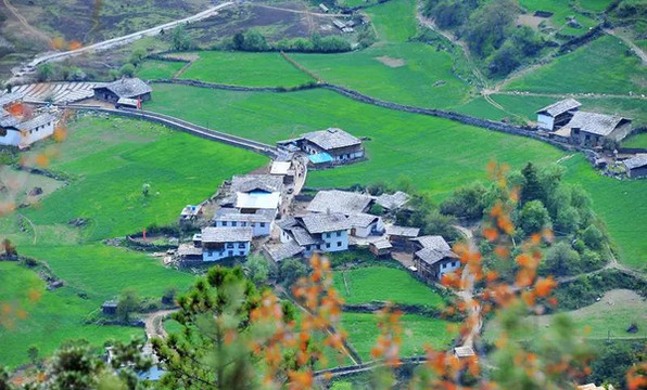 在下坡徒步的过程中会隐约看到一些藏式民居被绿色的田野所包围,这其实是雨崩下村,只是这个角度是比较特别。