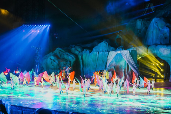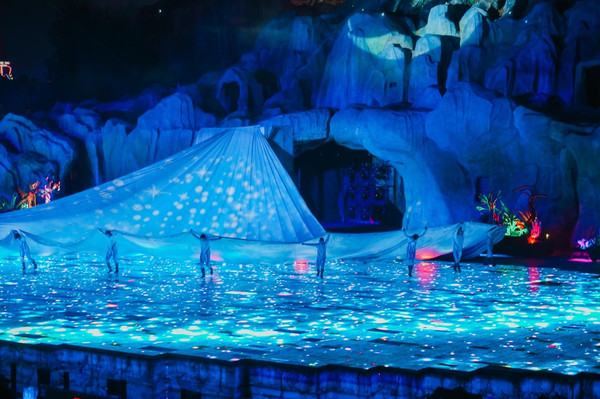 以“太极、五行、八卦”为主要视觉元素及贯穿全剧的理念,生动地表述了人与自然、人与人、人与自我既相互对立又和谐统一的关系。 该剧分为《春》——生命.繁衍、《夏》——爱情.童话、《秋》——收获.和谐、《冬》灾难.降临、《新春》——复始.新生等五大篇章。 充分运用了多媒体、影视特技、舞台机械、舞蹈、杂技、魔术、特效等各种演出手段,把 中国 古代哲学经典《易经》中的深奥的文化符号具体为风格各异的舞台主题与艺术形象。 高达35米的火山在漆黑如墨的夜幕下瞬间大爆发,地老天荒间,灼人的热浪扑面而来,火山熔桨急速狂泻,不过坐在前三排的小伙伴要小心哦,火真的很猛。