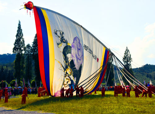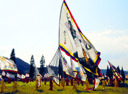 迎竖大旗系为道教之仪,源于战国,始于东晋而盛于元明。相传,所迎的旗原来不大,后越变越大,以示隆重,至今有八百多年的历史。一般的大旗长17米,宽16米,计270多平方米,大约用绸360米,大的有600多平方米。中间彩绘巨大龙虎凤。故称龙虎凤大旗。据记载,最多的年份曾迎过四十面龙虎大旗。