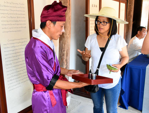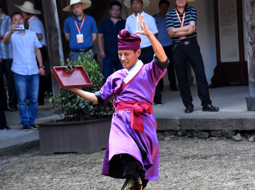 在玉山古茶场,记者还看这里的另一个非遗表演项目:幽默诙谐的《乌龟端茶》。乌龟端茶,又称寿龟奉茶,是婺剧小戏《浪子踢球》中的一段独舞,动作诙谐,耐人寻味,颇受观众喜爱。“乌龟端茶”流传于磐安县深泽一带,距今已有160年历史。全舞分两段,第一段是端茶和献茶,第二段表现得赏后的兴奋心情。表演的所有跳跃动作都是主力腿下蹲的“下桩步”。翻、转、旋等动作连贯,一气呵成。头部动作模仿乌龟形态,伸头慢,缩头快。