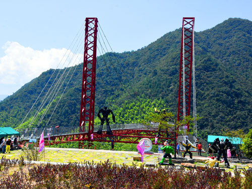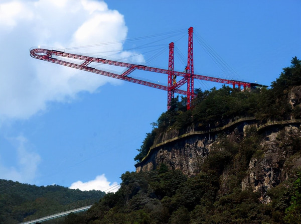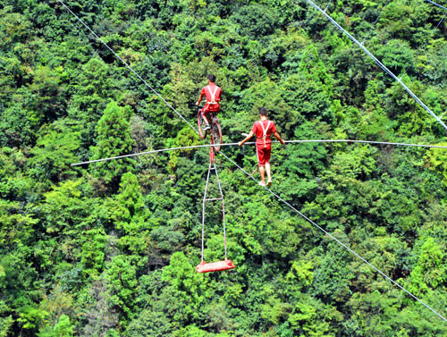 虽说走玻璃栈道玩的就是心跳,但害怕时驻足环视栈道两旁的壮丽风光景色,会让你在紧张与恐惧之情多少放松一下。可是行间途中,再看一眼空中走钢丝与摩托车飞驰,又会令你刚松弛一下的那颗心立马又悬了起来……