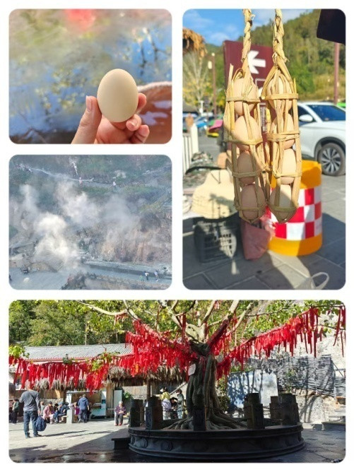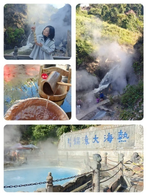D4:【热海景区】:一进景区,热气腾腾雾气缭绕,火山和地热并存,一路上山,时尔台阶时尔山路,途径热海石、蛤蟆嘴、美女池、珍珠泉、姐妹泉、鼓鸣泉、怀胎井等,景区有80余个温泉群,其中十来个水温高达90度以上,最后到达山顶的热海泉王大滚锅,这是一个水温高达96度的温泉池,涌水如柱再悠然滑落,边上有免费代煮鸡蛋的服务,用地热锅蒸, 20分钟后就可凭票来取。一棵巨大的菩提树下设了温泉泡脚区,水质柔软丝滑,富含矿物质和微量元素,是全身热疗的上佳之地。景区有观光车直达山顶省时省力,但容易错过一路的小温泉,适合体力欠佳的游客。