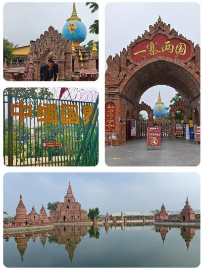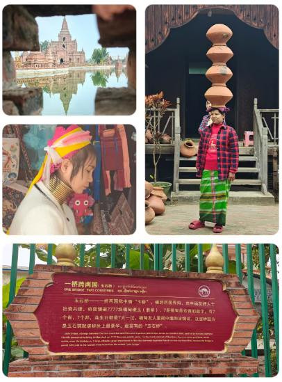 第一站【一寨两国】,位于中缅边境 71号界碑旁,寨中以竹篱、村道、水沟、土埂为界国境线,将一个傣族村寨一分为二。隔着围栏,有缅民在售卖商品。红砖城堡的建筑,里面满墙彩绘着佛教故事。一桥跨两国的玉石桥桥面镶嵌7777块翡翠。寨子很大,还有民俗村、孔雀园、两国秋千、空中玻璃桥、花海、果园、咖啡铺等