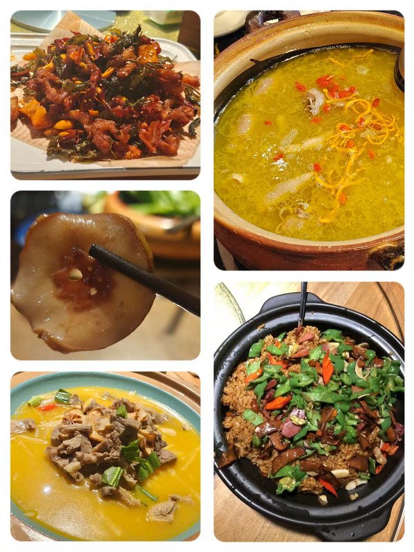 第三站:继续找吃的,炒饭真的是款款超值,牛杆菌焖饭、香茅烤鸡、建水豆腐、普洱茶酥五花肉、酸木瓜炖牛肉、土锅泥巴鸡。