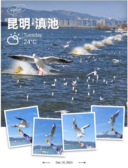 上午九点萧山机场出发飞昆明,下午1点到达长水机场,驱车前往【滇池】,四十公里用时1小时,顺路买了小面包,投喂海鸥用。每年11月至次年的3月,来自西伯利亚的红嘴鸥栖息于此。