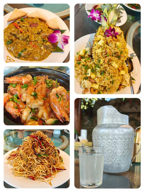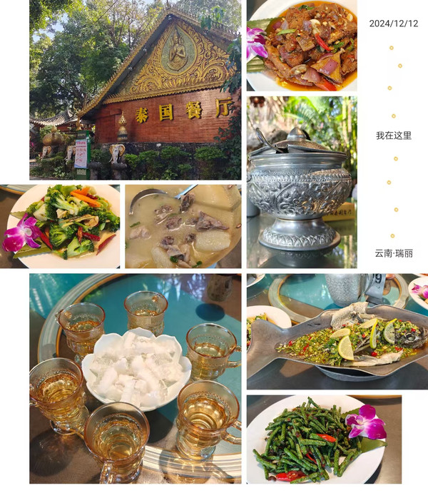 第三站:这家瑞丽的泰国餐厅是一家庭院式花园餐厅,室外花园就有十来个包房,树木茂密,鲜花盛开,感觉在热带雨林用餐。餐厅的服务员有些是缅民,会简单的中文。菠萝海鲜炒饭满满一大盘,大块的鱿鱼卷搭配腰果和菠萝,每一勺都是料,装饰用的石斛兰不是一朵,是一枝,不愧是云南;重点推荐柠檬汁,清香纯甜,一丝淡淡的恰到好处的甜;开背虾个大肉嫩,柠檬鱼也是招牌,视觉味觉双重享受。用完餐,离开瑞丽前往腾冲,180公里2小时。