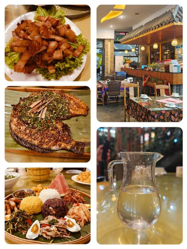 芒市东南亚风味的美食不容错过,这家装修很有民族特色,手抓饭太好吃了,三款三色米饭搭着一圈配料,搭配出不同口味,香茅草烤鱼香料丰富,油炸五花肉十分酥脆,柠檬撒纯纯的当地特色,黄金豆粉金灿灿,土烧白酒度数极高,酸辣口味是特色,每款菜量都很大,性价比极高。