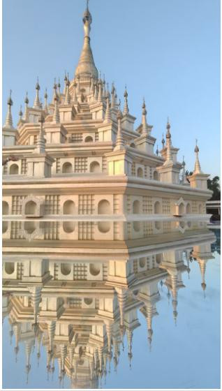 大银塔,塔尖以傣银纯手工雕刻,塔身以纯白色为基调,金塔银塔一个雍容华丽,一个典雅素静,一金一银屹立在雷崖让山之巅,孔雀湖之畔。