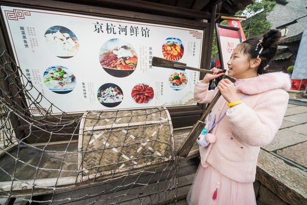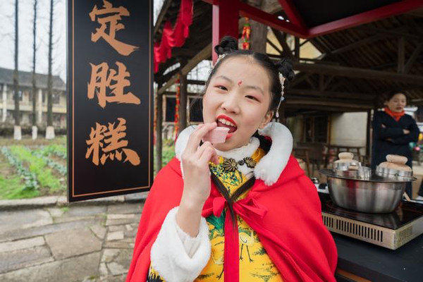 水上集市旁边则是乌镇特设的好味小吃摊,象征”旗开得胜”的定胜糕、“红红火火”的桔红糕、“甜蜜幸福”的海棠糕、“团圆美满”的烧饼与汤....。