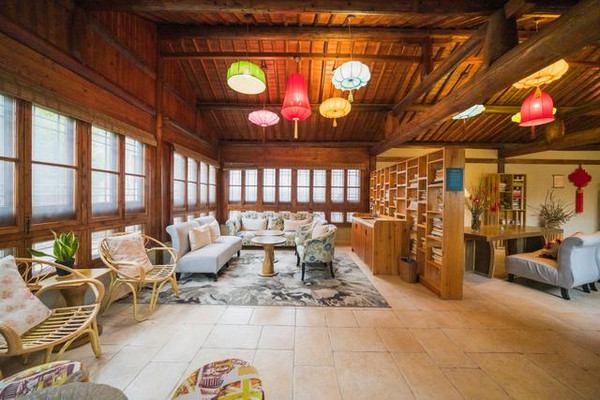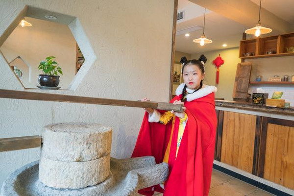 办理好入住,管家车将我们拉到磨坊乡村民居,进入磨坊如同进入餐厅,书香气味中又有些许的恬淡。管家告诉我们,如果饿了渴了可以点自己喜欢吃的东西,一价全包,不用另付钱。在磨坊可以吃到的是豆浆、不同口味的豆干、拌面、馄饨等等,给玩耍累了孩子们一些能量的补充。