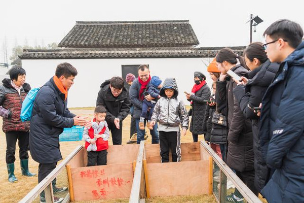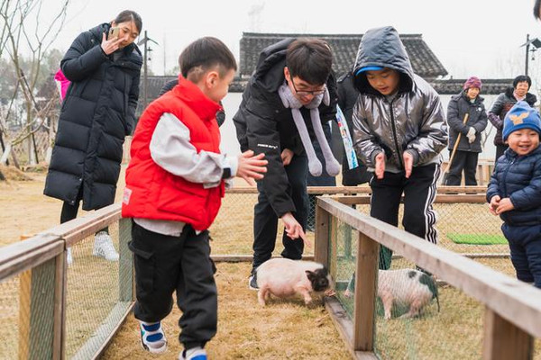 沿着宁静的乡村小路向前,不知不觉走到了小动物居住的地方,两只萌哒哒的小猪正等待着参赛呢。这正是冬令营的活动之一,小朋友组成两队,轻轻在小猪后面拍掌,小猪顺着跑道向前,哪组的小猪第一个跑到终点,即哪组胜利。与小猪这样近距离的接触,对女儿来讲还真的是第一次,这么可爱的小猪让小朋友们欢喜雀跃,不肯离去。