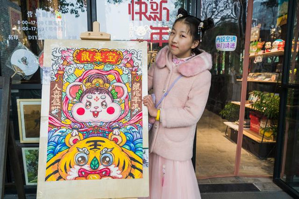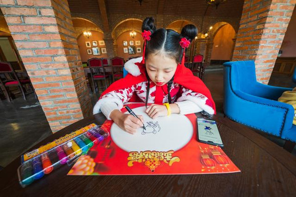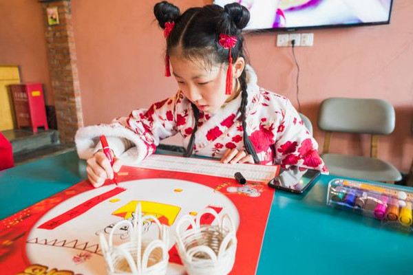 说起画画,孩子们都是喜欢涂涂画画的,女儿选择了一只小老鼠,老鼠脚下踩着大元宝,左右还画有一幅对联,写着:吉祥如意,年年有余。绘画的过程都是自我发挥自我设计过程。每个孩子绘画着自己对春天的释意,用画的语言诉说着对春日的祈愿。这又是冬令营特别安排的活动之一。
