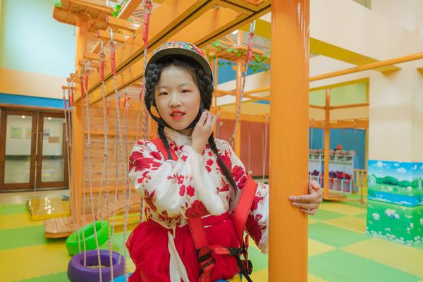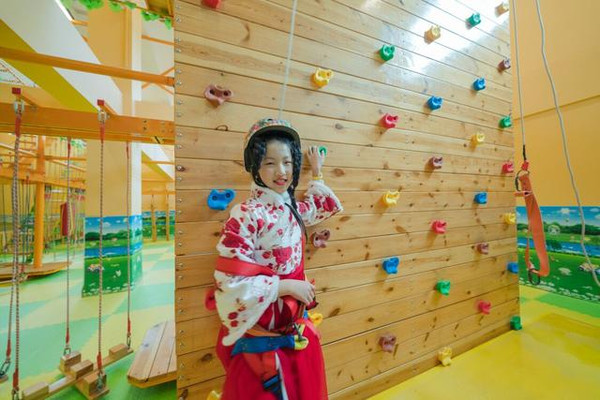 攀岩拓展区玩起来需要一定的体力,更需要肢体的技巧性,锻炼孩子手眼脑协调能力。而且安全措施最最给力,头盔和安全绳索从头至尾佩戴全身的,还有专业教练一对一跟随。