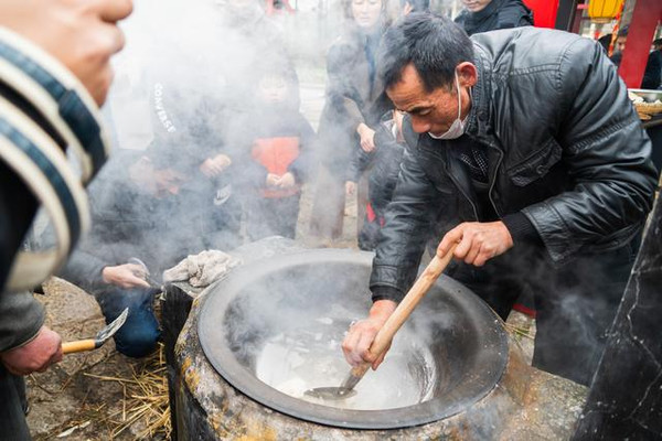 乌村的村头集市的村民们正在用最原始的土灶制作镬糍,把煮烂的糯米刮压成一层薄薄的米粉皮子,均匀地贴在烧热的锅底四周,待皮子边缘翘起,将它铲出,三下五除二,镬糍就做好了。