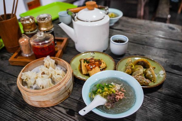 我选择了一笼烧卖,配上加了虾皮榨菜的粉条,一小碟卤汁浓郁的豆腐干和几个外壳酥脆的煎饺。烧卖皮薄如纸,加了笋丁的馅儿鲜得能让人把舌头吞下去。