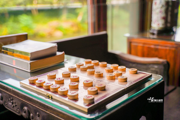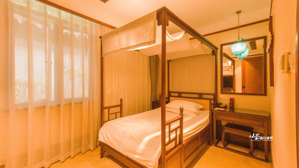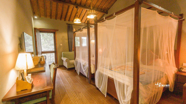 客房内的陈设也以原木家具为主,古朴典雅,拉开窗就有一墙的青绿。