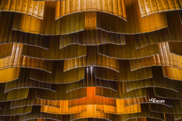 大堂屋顶的设计颇有巧思,数百段铭刻了《文选》竹简次第悬挂下来,间以明黄的灯光。