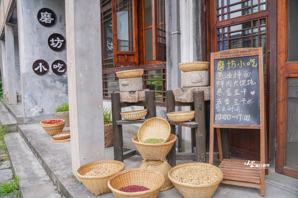 乌村的住宿区有一个非常有意思的概念——“组团”。组团这个名称来源于旧式生产队的生活,以各个农业生产任务为主题,将生产队成员划分成不同的的组团。我们选择了磨坊主题组团,这是一栋经过重新改造的老民居,墙面与青瓦上蜿蜒着青碧的爬山虎,二楼有小小的阳台,随处可见磨盘石臼。选择磨坊组团有一个很重要的原因是因为这里的食物,这附近还有一个正在使用的磨坊,可以吃到手磨的新鲜豆花豆浆。