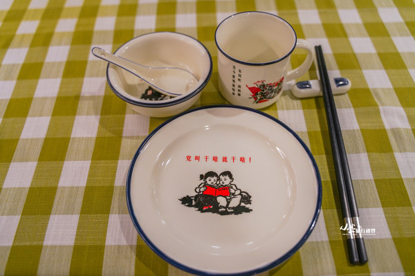 每天的套餐都各有不同,食材以村内自产的时令蔬菜为主,从采摘到上桌不超过一小时。这里的搪瓷餐具非常有意思,蓝白配色,加上熟悉的招贴画和标语,想必能勾起不少人儿时的回忆。