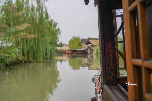 经过主河道的时候于桥上放目远眺,河水青绿,柳枝柔软,临水的屋宇仿佛被墨色层层晕染,淡雅可爱。