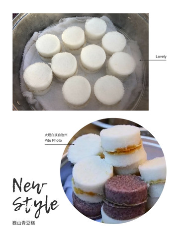 在巍山的小吃里,有一种集色、香、味、形为一体,蓬松绵滑的青豆小糕。这是一种时令小吃,只有结青蚕豆的季节才能吃到。青豆小糕以大米、青蚕虫为主料,颜色碧绿,蓬松绵滑,青豆香气扑鼻,入口十分香甜,并且很粘又很糯,口感十分棒。当地人将每年新鲜采摘的青蚕豆煮熟磨成细面和米面拌在一起,蒸出来的小糕颜色碧绿,再加上红砂糖的色泽,芝麻的香气,一合合美丽的青豆小糕,成为巍山人最喜欢的早点。
