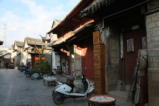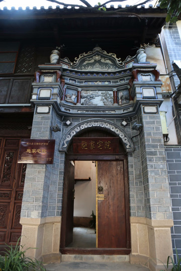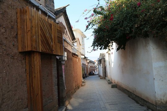 古城内的民居多数是院落式的,保存了大理白族的青瓦坡顶、“三坊一照壁”、“四合五天井”土木结构的特色。殷实人家则两种布局相连形成走马转弯阁楼,有的是以“六合同春”布局,有的是两院三方一壁照相连。民居大门多为单檐或重檐,木架瓦顶,出阁架斗。盆栽花木,有“满城朱兰风亦香”的赞誉。