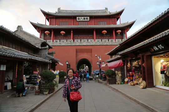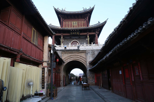 古城筑有城墙,东南西北四个城门,城中心建星拱楼,形方如印。逛完一圈,夜幕已经降临。月光洒下,如轻纱般将万物覆盖,而夜色中的古城,却是不折不扣的梦境,或轻愁或薄喜,或挟一怀平和。来到小吃一条街,却没有任何食档,回到宾馆座落的南诏西路,又没有餐厅。时间已晚,饥肠辘辘,只好回酒店煮食方便面。