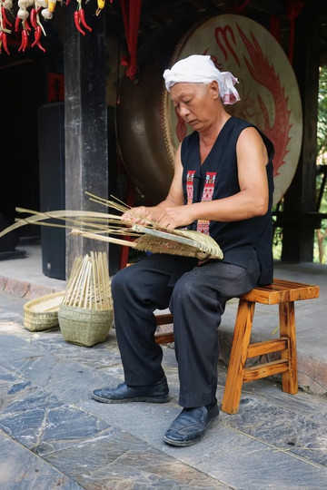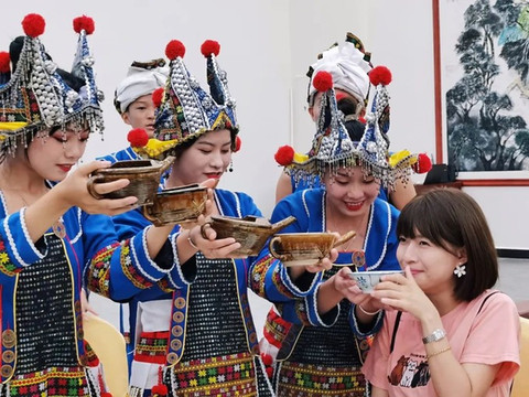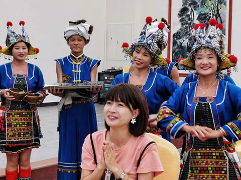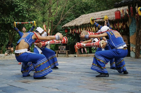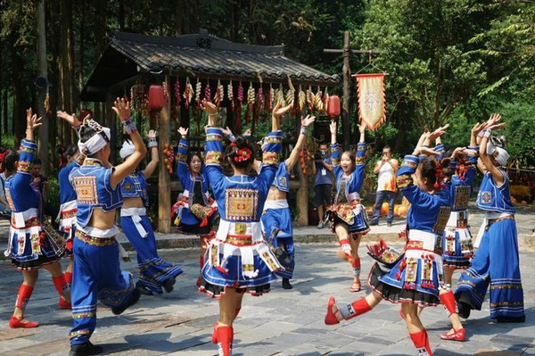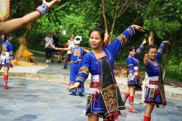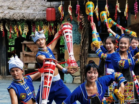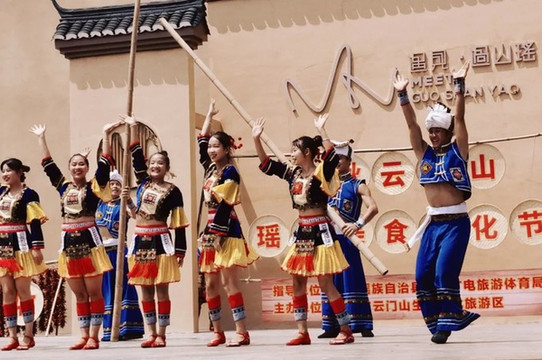 在古村落的大院里,游客可在吊脚楼旁欣赏传统的瑶族长鼓舞,也可和过山瑶阿哥阿妹一起跳竹竿舞,载歌载舞的过山瑶生活十分诗意闲适。