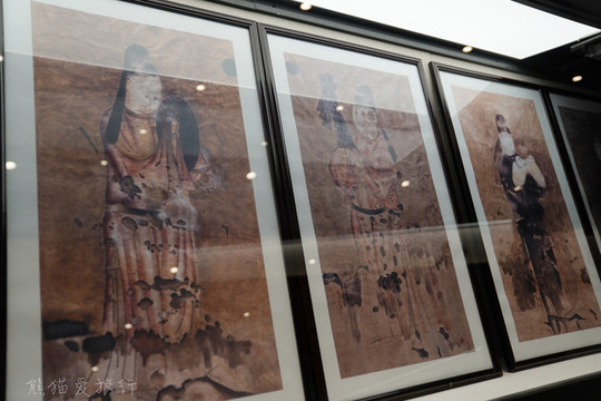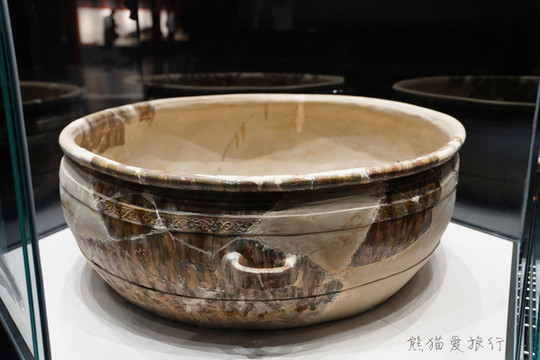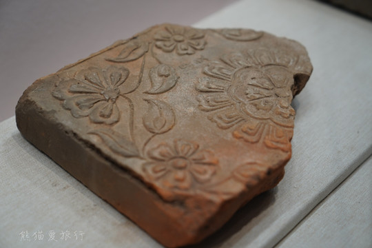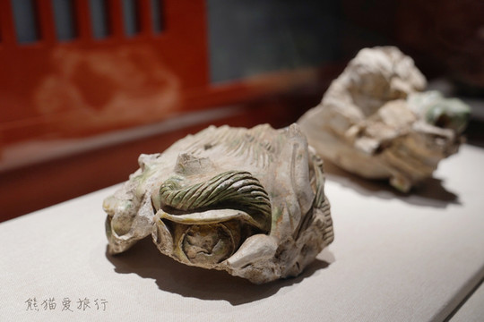 跟随博物馆导引的介绍,还能看到曾经渤海国的文字瓦片、檐头专用筒瓦,檐脊装饰兽头、出自贞孝公主墓葬的渤海国墓葬壁画复制图片等等,这里还有用三彩残件拼出来的大缸,类似于北京故宫的铜水缸,曾经被放置在宫殿前,储水防火用。