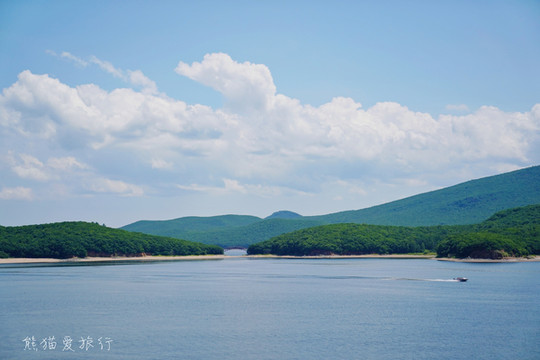 在镜泊湖,看瀑布跳水游船眺望毛公山