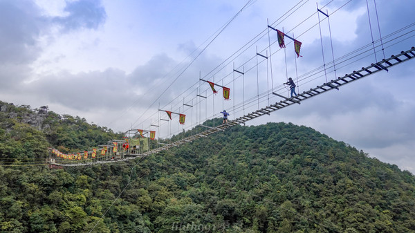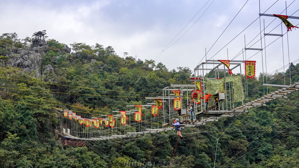 千岛湖石林景区由狮子山和象背山组成,山间峡谷幽深,见之断魂,所以其上有一桥,仿佛位于云端,被称为“好怕怕尼泊尔桥”,整座桥长160米、高度则有120米上下,看一看就觉得心里晃晃悠悠的。