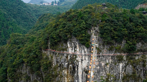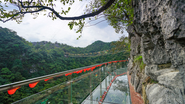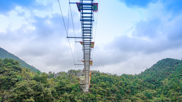 边上还有长约150米的玻璃栈道,站在玻璃栈道上,颤颤巍巍,小心翼翼走过,再抬头看一眼那悬桥,那更是心如擂鼓了。