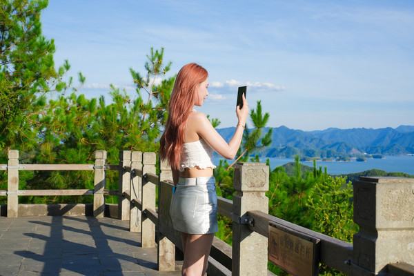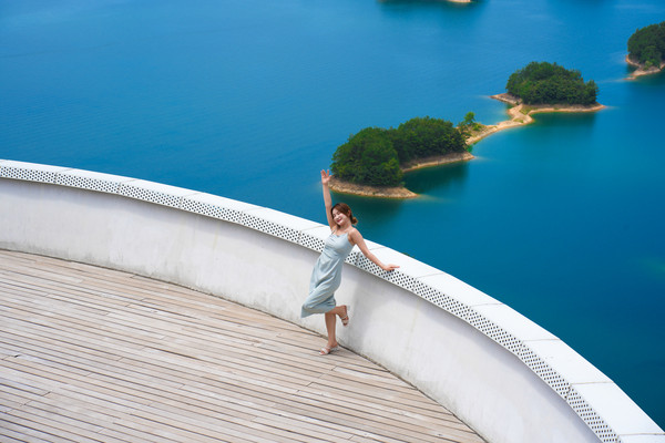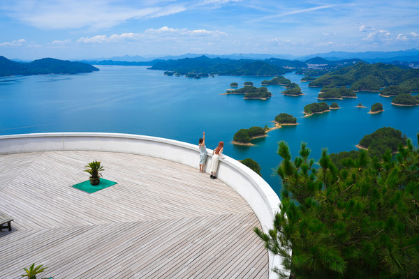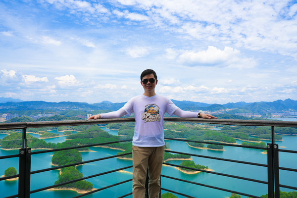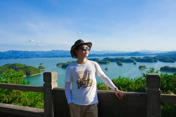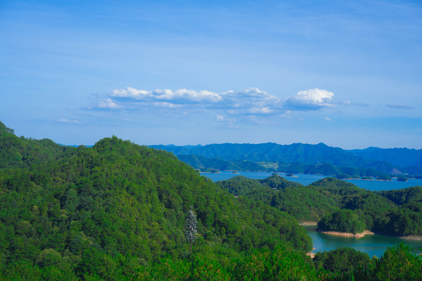 登上千岛湖黄山尖最高一层观景台,放眼望去,群山连绵林海叠翠,山风徐来松涛呼啸,登山顶而远眺千峰竞秀万壑滴翠,高峡平湖绿水如镜波光潋鱼跃湖面鹰翔于天,苍穹如碧浮云虚幻。清风徐徐荡涤俗念,薄云柔夷轻拂身心。一湖碧水映蓝天之笑,九洲灵韵聚千黛。掬水月在手,染花香满衣,在这里我感触到了令人怦然心动的美。