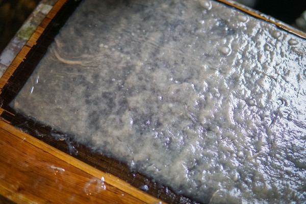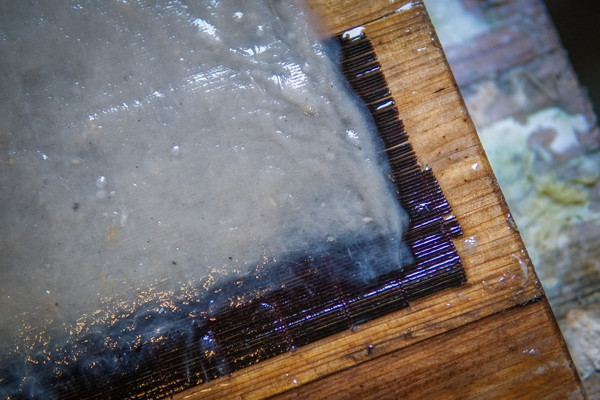 第三步,抄造:用捞纸器捞取适量纸浆,滤掉水后,将蔑席上沉淀的纸浆膜倒扣在案板上,形成薄片状的湿纸,并反复操作。