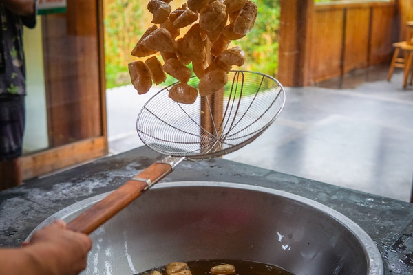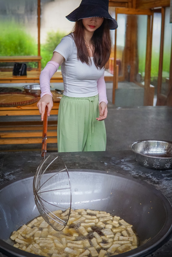 豆腐工坊,充满当地土木结构民居特色的建筑,与里头热气腾腾的豆腐制作现场相得益彰,泡豆、磨浆、过滤、煮浆、点卤、压模,村民们有条不紊进行着传统豆腐制作流程,热腾腾的场景仿佛是一幅活动着的画。