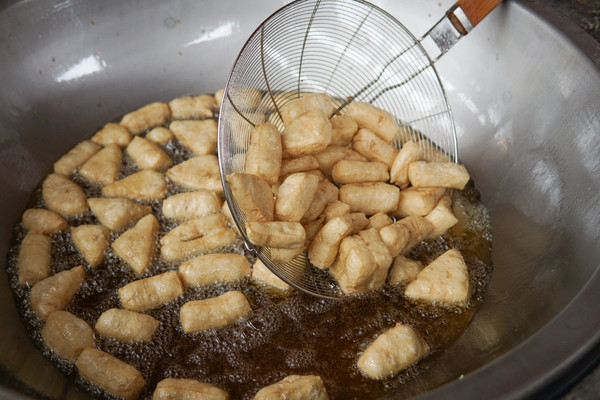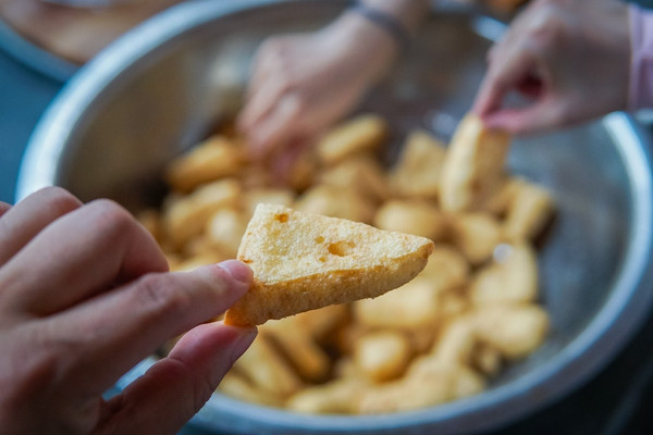炸好的油豆腐跟店里看到的是不一样的,脆脆的外脆里嫩,吃起来就像臭豆腐一样。