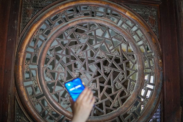 门的两边有两个。非常有特色的圆形的窗棂,原来这里有两个红灯笼,光线就透过窗棂把窗子的影子给放大了,非常的好看。