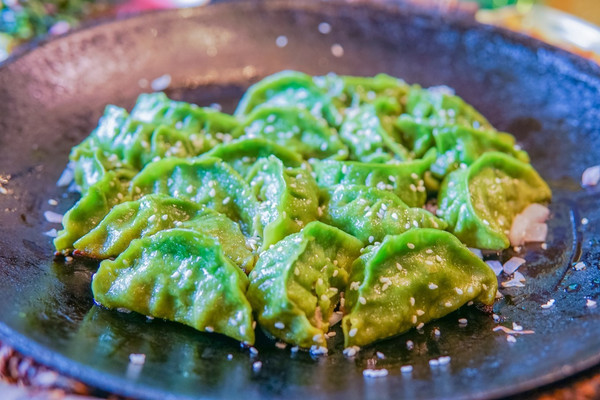 这个饺子的颜色上面是绿色的,下面是焦黄的,让人看得垂涎三尺啊,特别是撒上的白芝麻,真的是画龙点睛增加了香味。