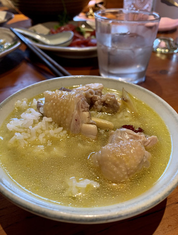 民宿有餐厅、咖啡酒吧、有活动中心、晚上还有剧本杀。晚餐价格公道,有歇力茶土鸡锅、笋干炒腊肉、松阳香肠和油麦菜,鸡汤实在太美味了。
