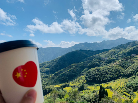 白银谷是梯田区域的小村子,有点像陈家堂村。我们到了缆车总站被云端咖啡吸住了,不能移步。咖啡馆拥有corner view,所有巨大玻璃窗都被全部向上向外开启,真是个绝佳的景观台。对着梯田,吹着小风,喝着咖啡,为祖国母亲庆生。