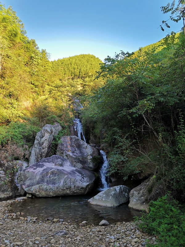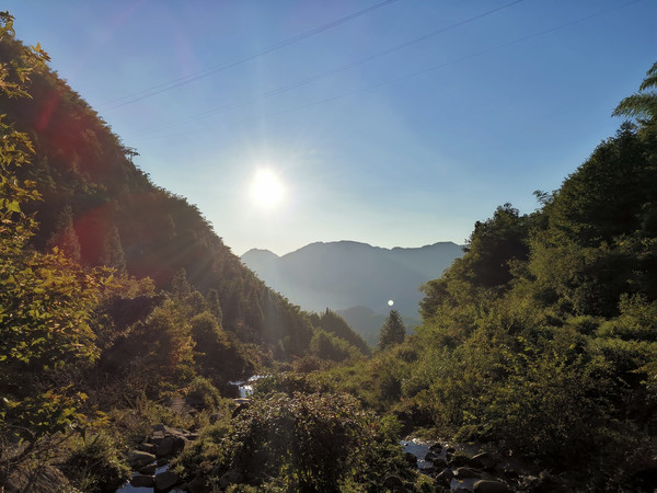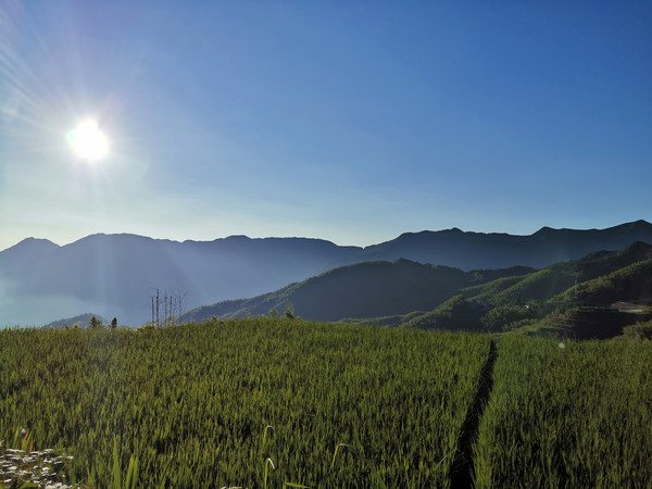 在小馆子里听人闲聊,就说早上如果要看日出,就要4:30出门,大概5:30爬到山顶差不多可以看到,我问老公去不去,他说他要睡懒觉,我一个人也不敢在天没亮的时候就去爬山,于是第二天就睡到了自然醒(老年人的生物钟,自然醒也就是五点半),出发爬山,一路上山都没有人,一个人还真有点害怕,但是又觉得山谷里人很少,应该也没啥坏人,就这样一边自我安慰一边忐忑地往山顶走,快走到山顶时,看到有几个人陆续下山,估计是去看完日出了,一个老爷爷还说我胆子那么大一个人爬山,其实我心慌没表现出来而已。