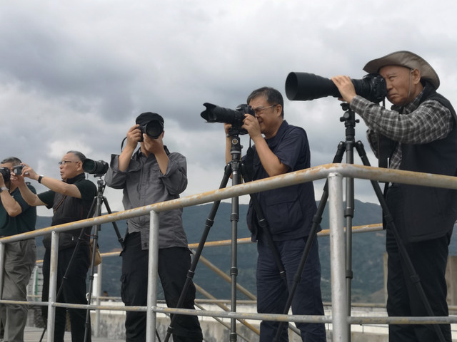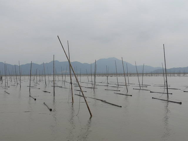 既然这里看不了,我们就决定去下一个“沙江S湾”看看,从南湾甲骨文到沙江S湾仅仅23公里,半个多小时的车程,过去很快的。但是这里必须要告诉再打算去的朋友,这个地方开车非常不好走,如果去的时候车多人多,最好在离目的地还有一公里的小镇子把车停好步行过去,否则如果堵住了,狭小的巷子加上一定的陡坡,倒车出来可就是个技术活啦,我们去的时候不是旺季,车辆不多都堵了一会,按照导航进入一个小巷后右转上陡坡,面对的是一个学校,以为可以在学校停一下,交个停车费都OK,但是学校不让停车,让我们停在学校旁边的一个小院子里,车开到校园都是狭小的巷子,车技不好的有点难受,过了弯道小巷后有一个很小的院子,大概可以停五六台车的样子,先进去的一定要记得掉头过来,车头朝外方便完了开走哟。我们一进去就是三台车,里面已经停了一台车,我们一辆一辆的慢慢掉头,这个时候我后面进来一辆广州牌子的SUV,车停了以后下来了两位头发花白的老人,大叔先下车,指挥阿姨停车,看到我们武汉牌照的车就问:‘你们是武汉的?’我说“是的”,大叔说和我们是半个老乡,他们是襄阳人,儿子在广州做事,他们现在住儿子那里,我问大叔多大年纪,大叔说75了,阿姨73岁,我情不自禁的竖起大拇指,从心里钦佩这两位老人,70多岁了还能自驾出来旅行,阿姨开车稳重娴熟,那么狭小的巷子,这么大个的SUV,车技肯定杠杠的,加上精神头很好,下车后还拿着单反相机,真是值得我们学习,也是我今后的榜样。好啦,言归正传,来说说这个沙江S湾吧,停好车也是走一小段小路,门口买门票每人20元,而后从一幢不知是废弃的还是烂尾楼进去,上到楼顶观看,到这里已经四点过了,潮水退了一些,晾晒紫菜的竹竿大多露出了水面,看着确实很漂亮,在这里色友也很多,大多“长枪短炮”的架着三脚架,为了等四点多有一条船进湾的画面,我们也同那些专业的摄友一起等,听说我们是武汉过来的,都说我们武汉人今年不容易,是全国人民的英雄,是世界人民的英雄,听到他们这么说心里很感动,能被大家理解、不歧视武汉人都可以了,所谓的英雄赞美就不用了,我们都是很普通的武汉人,当时几百万人都这样呢,没什么。
