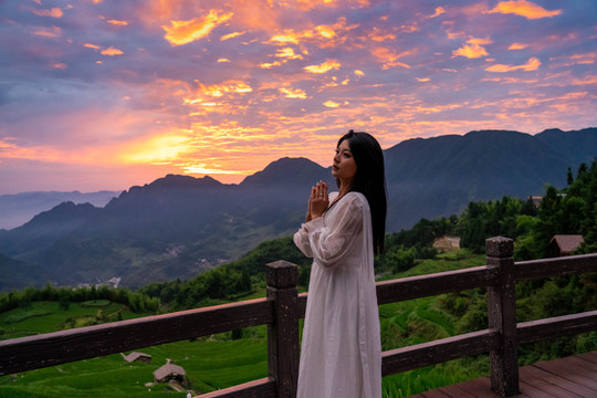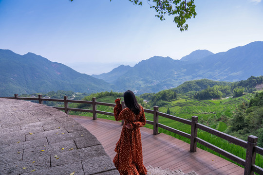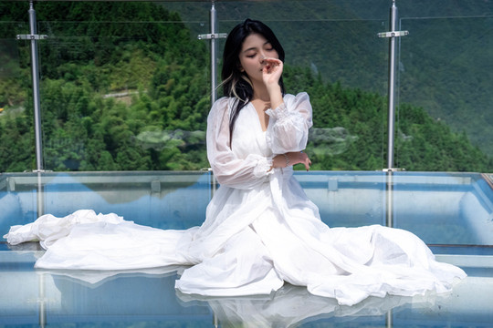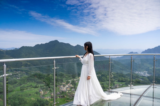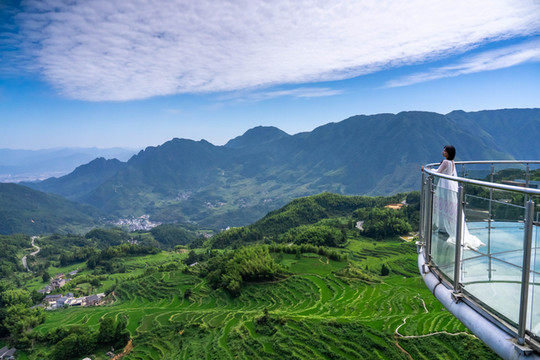 一袭长裙,行走在透明的玻璃观景台上,俯瞰梯田,非常的有感觉。