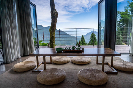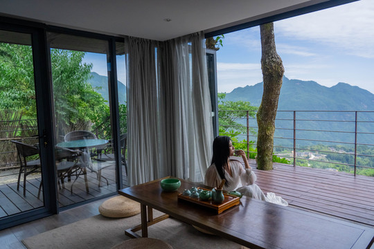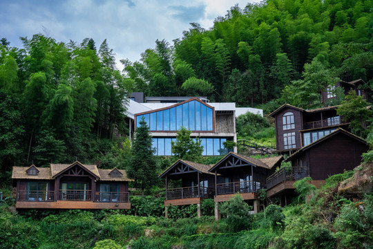 如果想要看梯田日出的话,可以选择住这家云逸的院子,酒店设计风格很美,独栋的木屋和周围的山林环境融为一体。
