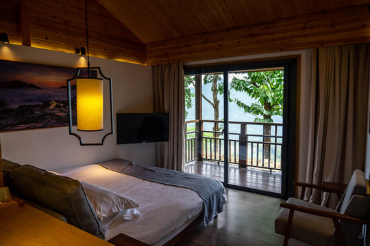 房间是独栋的木屋,有客厅区域、喝茶区域,上下两层,共有三个房间,空间非常的大,全家出行都能住的下。