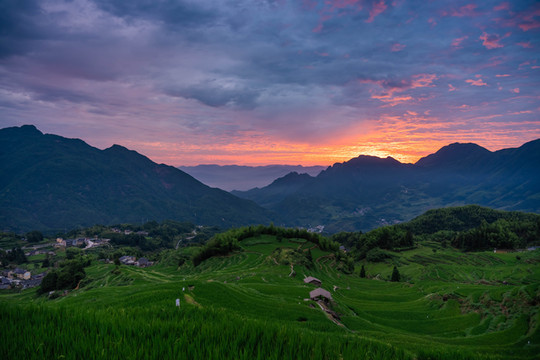 5点多的时候,天边渐渐的泛起了金黄色,远处的高山之上,太阳的金色光线渐渐的穿透了云层,肉眼所见比照片呈现的更为的震撼,看到这样的美景,可以说这趟就算来值了,来云和梯田,一定不要错过日出。