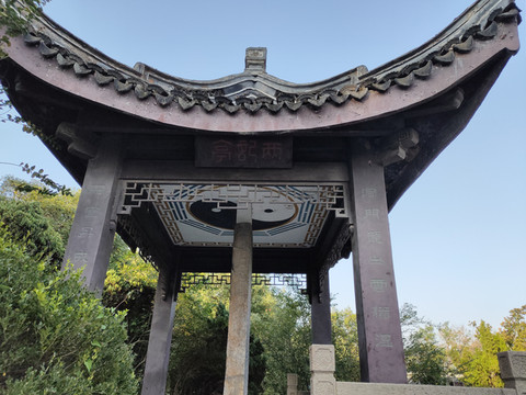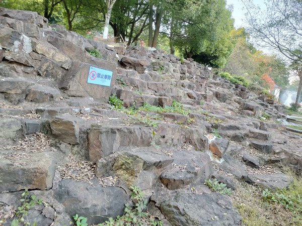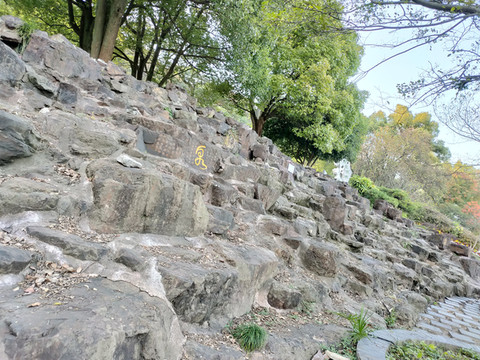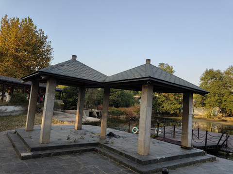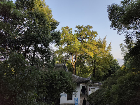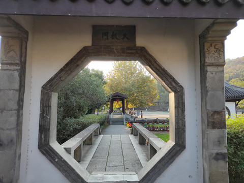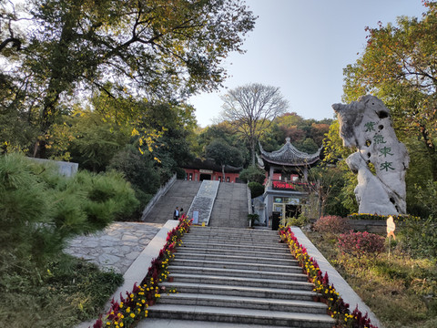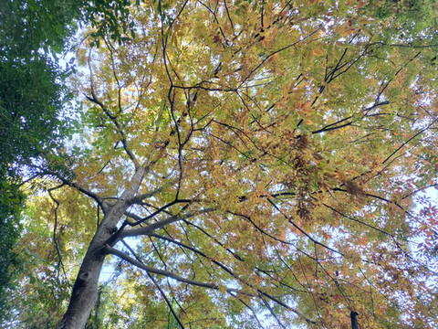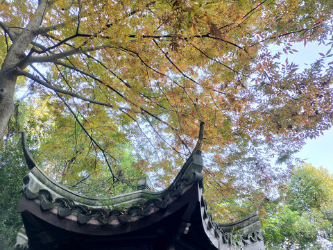 两记亭也令人惊艳,高大的树木已经被霜侵得半红,还有一半则是半黄半绿,被阳光一照,简直太美了。仰起头,大树配着古典风的亭子,简直就是一幅天然的秋色画卷。