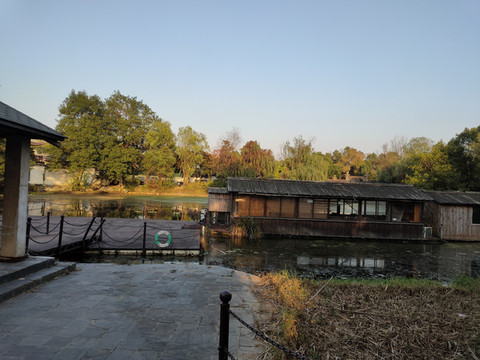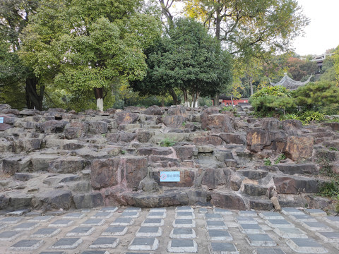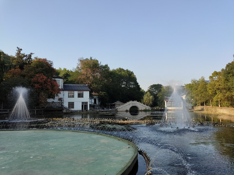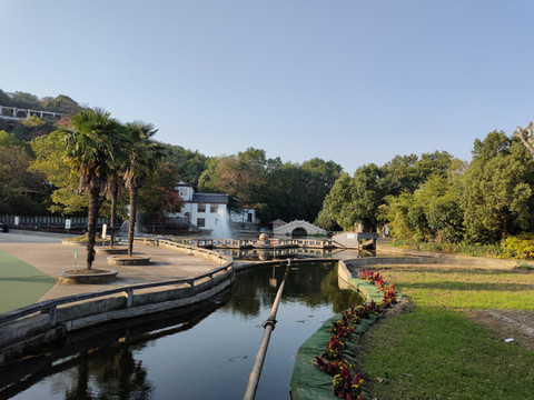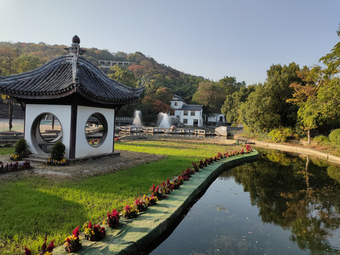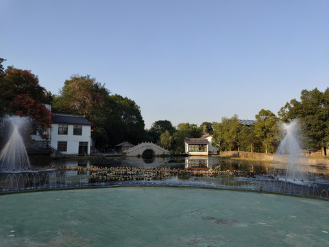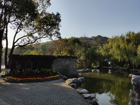 车停得有点远,不过沿路走过来还可以看看盆景,有一方小湖泊,虽然睡莲花已经差不多谢了,但还有几朵很执着地绽开着笑颜,算是为这方湖泊增添了两分颜色。旁边的石头上刻着“桃花源”,这一带很安静,没有什么人。估计车技好的游客总能在大门周围找到一块犄角旮旯的地方泊车,而我要不停在车位里,总觉得心里发虚。