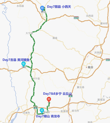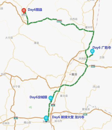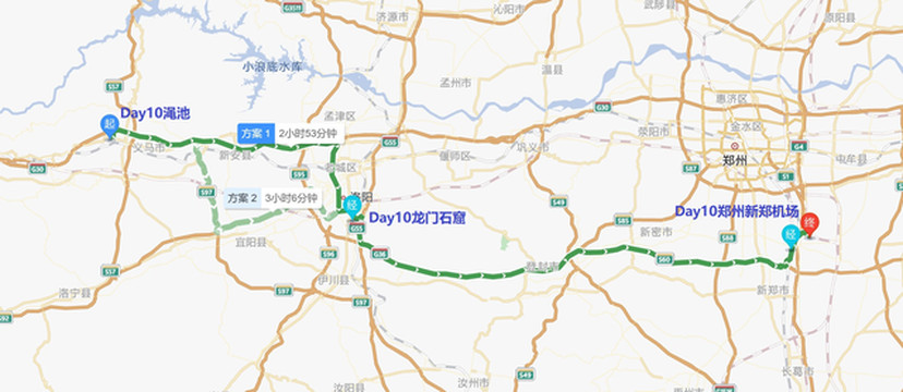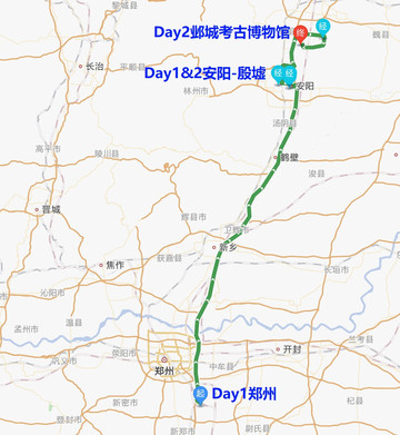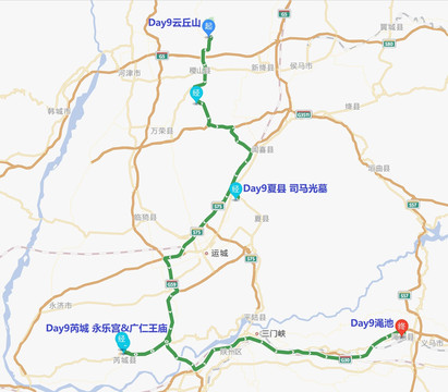 Day1郑州>安阳,Day2安阳>邺城,Day3邺城>平顺>长治,Day4长治>高平>晋城,Day5晋城>新绛,Day6新绛>汾城镇>汾阳>隰县,Day7隰县>稷山>乡宁,Day8乡宁云丘山,Day9云丘山>夏县>芮城>渑池,Day10渑池>龙门>郑州